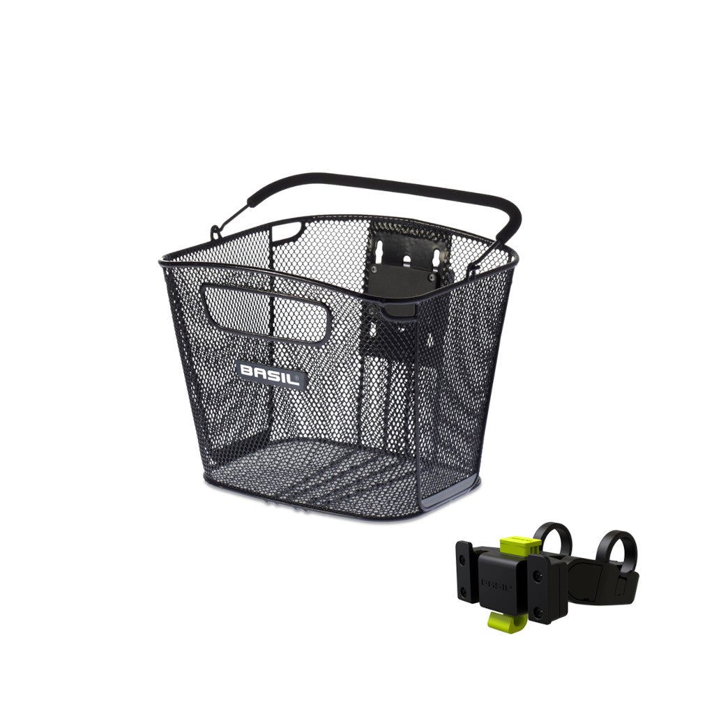 Basil framkarfan kemur með festingu til að festa á stýrið. Hentar einnig á rafmagnshjól sem eru með skjáinn fyrir miðju stýrinu. Karfa og festingin passar á flest hjól.
