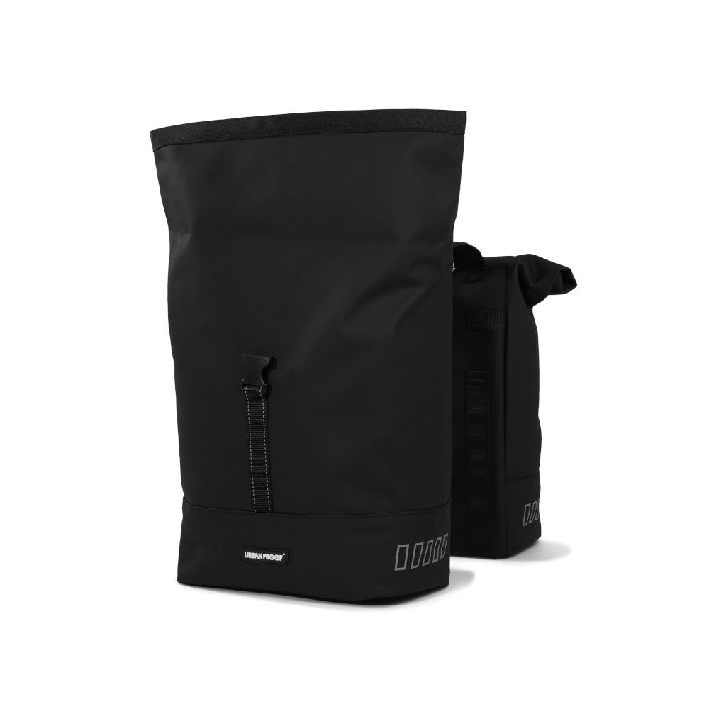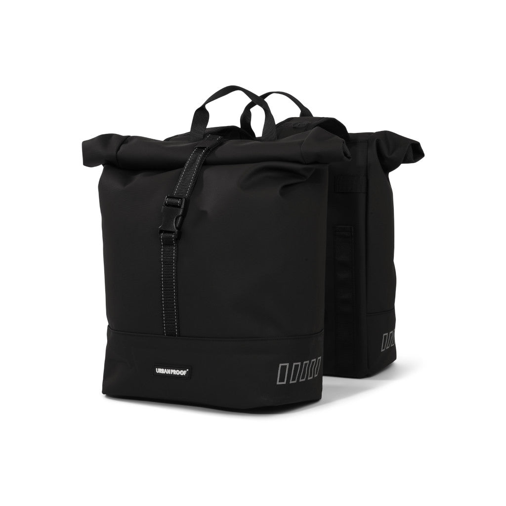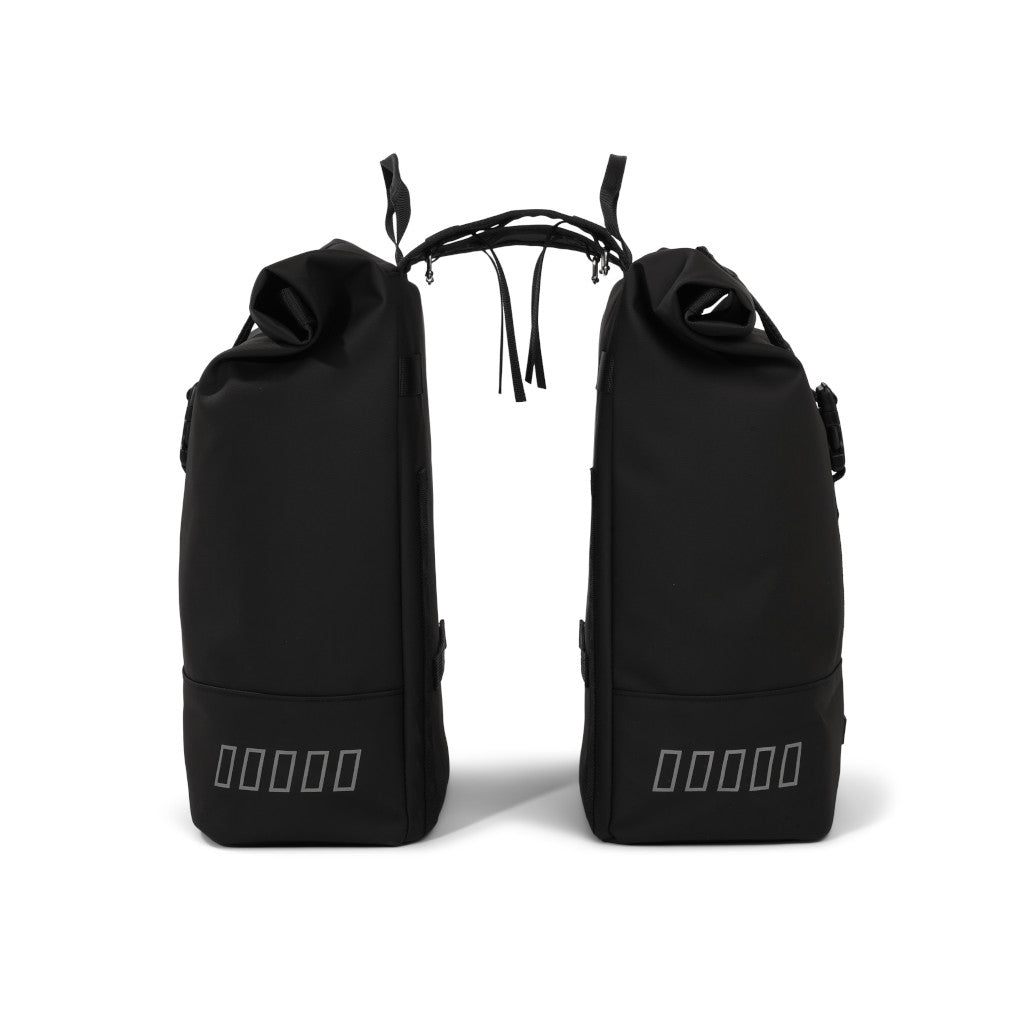 Stílhrein og nútímaleg tvöföld taska sem fer yfir bögglaberann. Rúllanleg lokun með sylgju til að festa við töskuna. Handföng eru á töskunni þannig að auðvelt er að halda á henni.