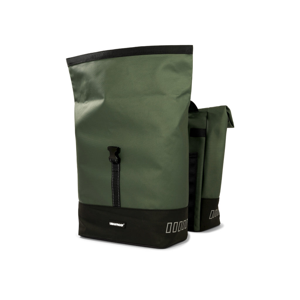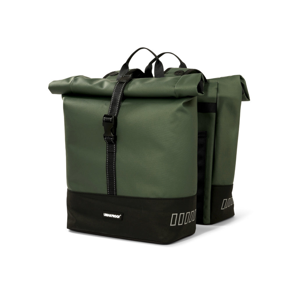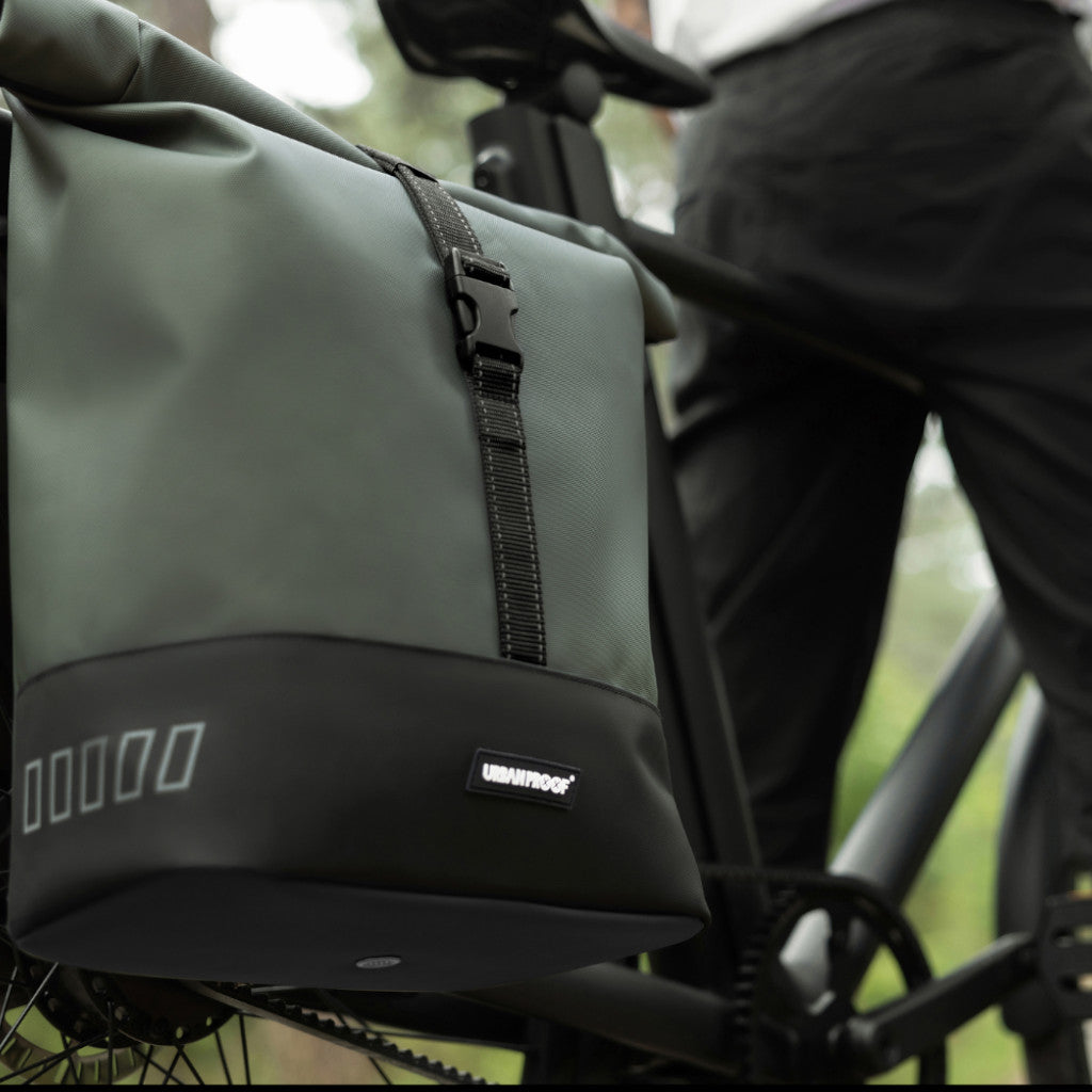 Stílhrein og nútímaleg tvöföld taska sem fer yfir bögglaberann. Rúllanleg lokun með sylgju til að festa við töskuna. Handföng eru á töskunni þannig að auðvelt er að halda á henni.