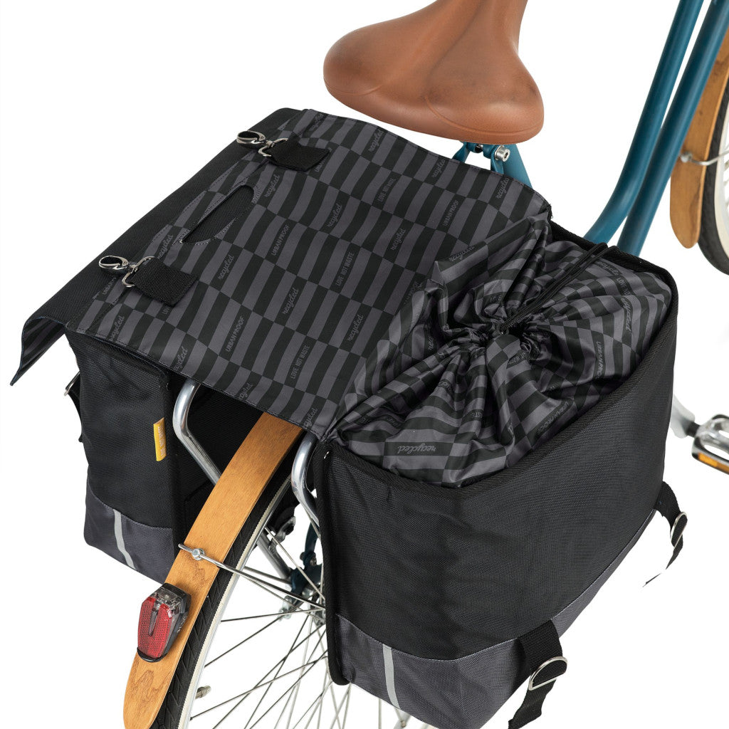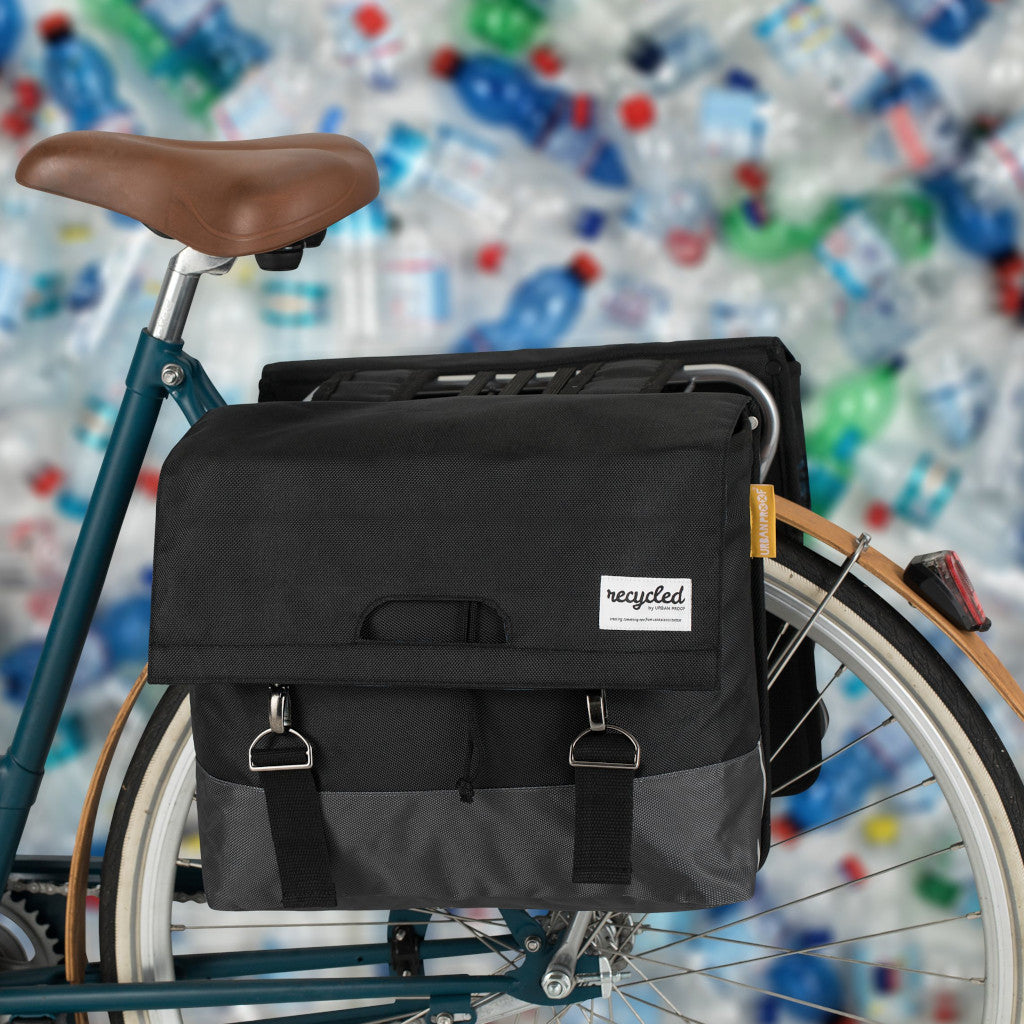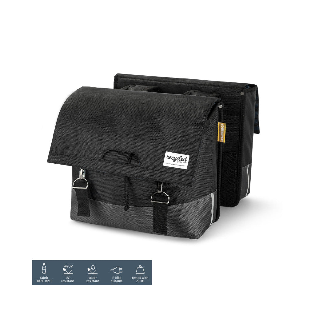 Sterk 40L hjólataska með styrktri bakhlið og botni. Hjólataskan er gerð úr endurunnu PET efni (RRET). Taskan er með tvö stór hólf, hvert hólf 20L samtals 40 lítra.