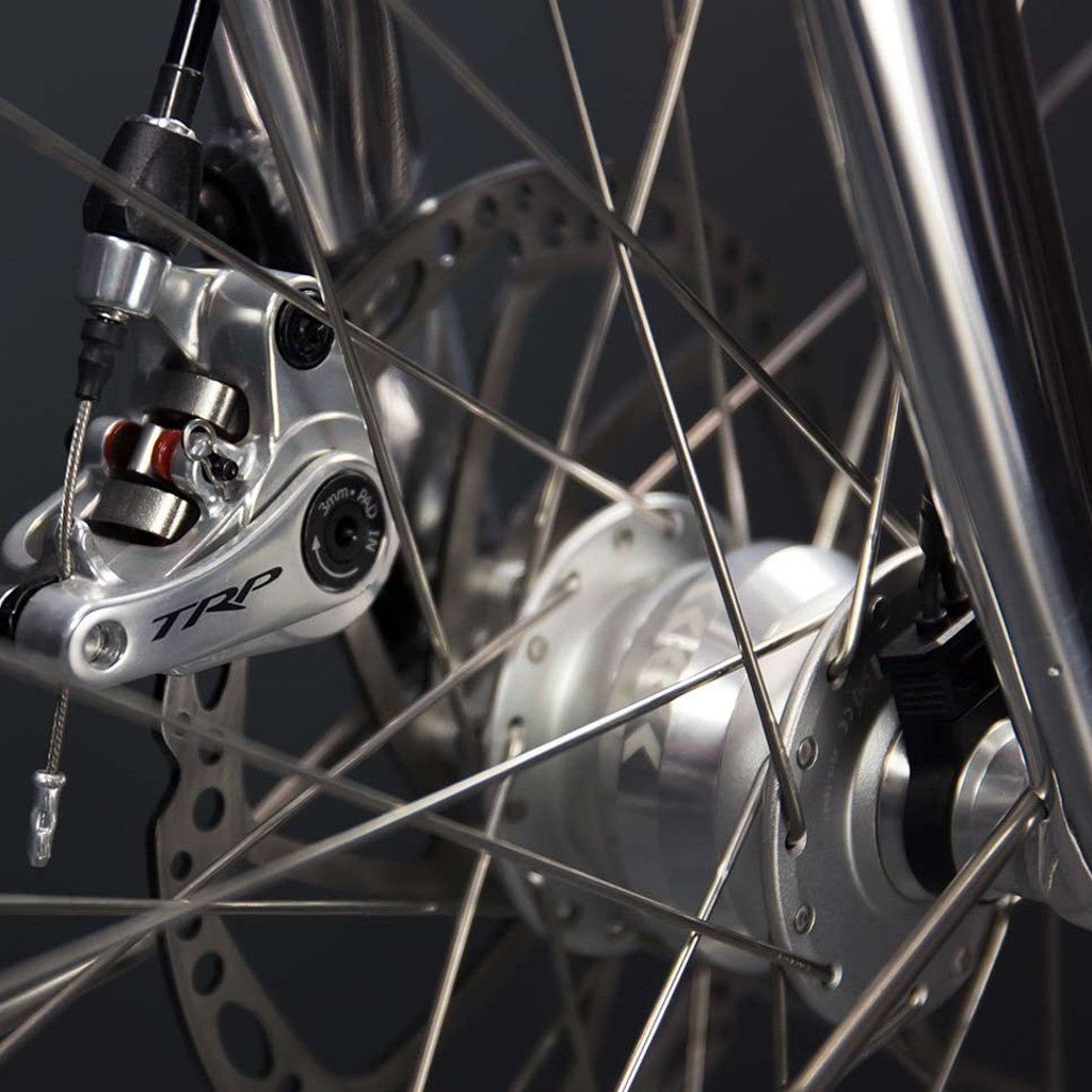 Gjarðir: Shutter Precision - PD-8X hub dynamo disc, Shimano - Alfine 8-/11-speed internal gear hub, Alexrims - CXD26 rims with eyelets, Sapim - Race spokes, 3-cross and 2-cross laced