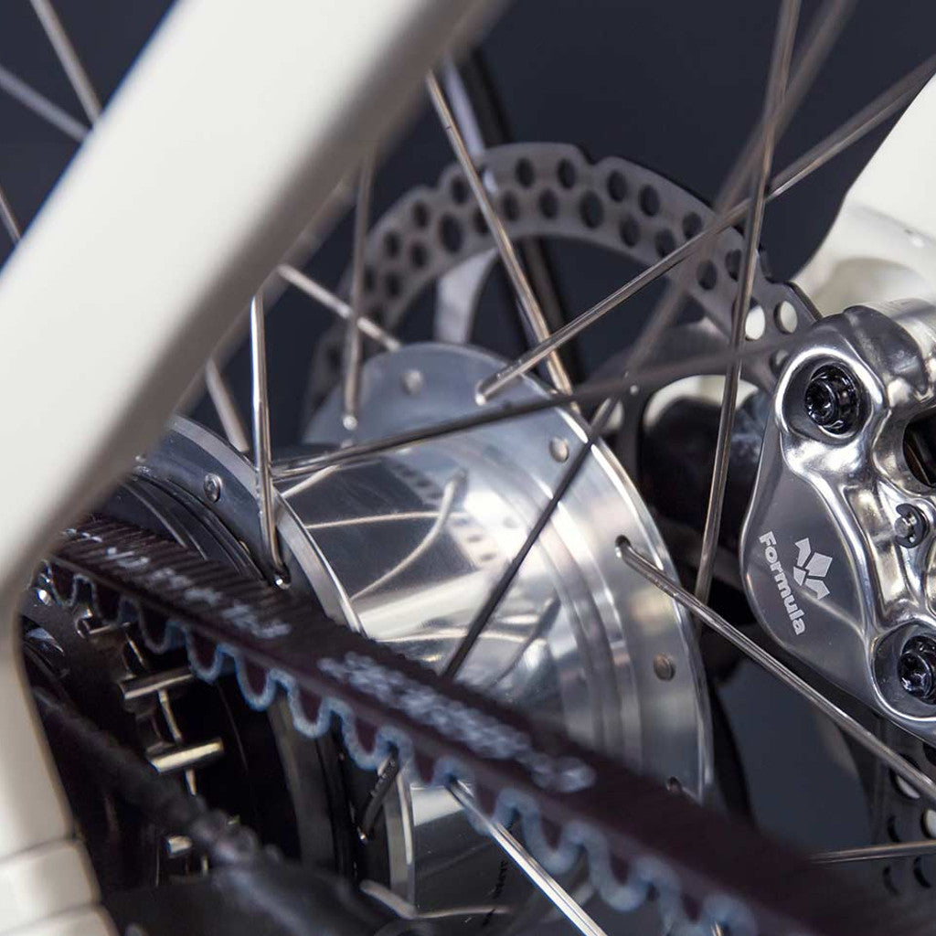 - Stell: Aluminium (AL6061-T6), triple butted tubing , forged motor bracket, multi-cell down tube, forged dropouts with slider-belt-tensioning-system and Schindelhauer belt port, integrated seat post clamp, internal cable routing, smooth welded