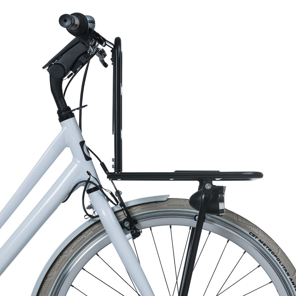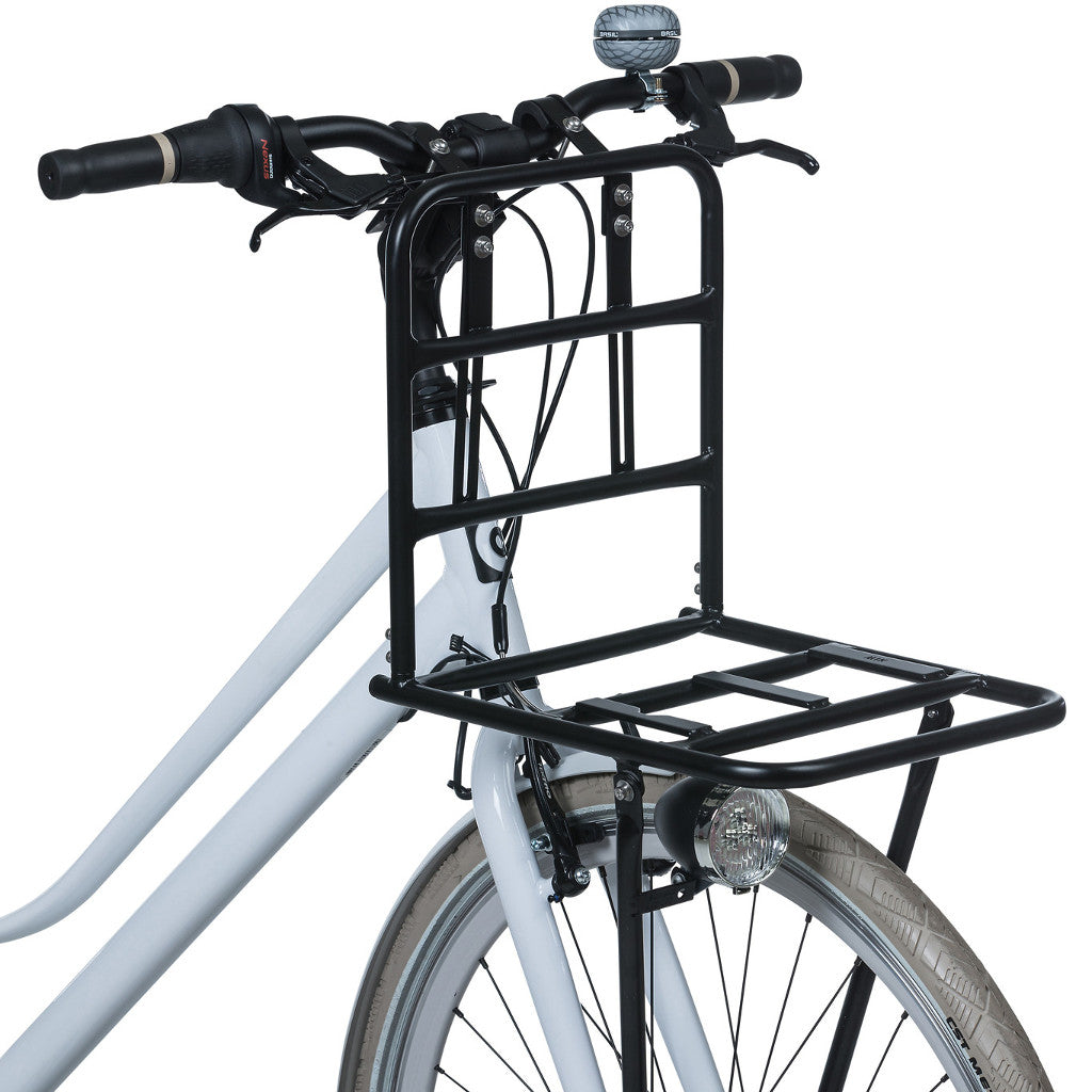Basil Front Carrier er sterkur og stór frambögglaberi með festingu á stýrið og framgjörðina. Festingin á stýrið er með hæðarstillingu og passar því á næstum hvaða hjól sem er. Frambögglaberinn skapar aukið pláss á hjólinu og ber allt að 10 kg. Möguleiki að festa ljós á bögglaberann.