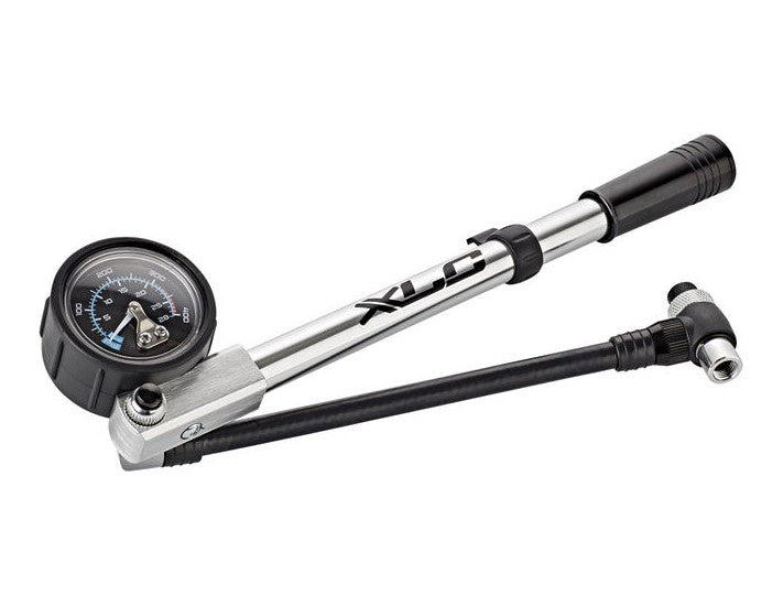 Dempara pumpa fyrir fram eða aftur dempara. Þrýstingur 400psi eða 28 bar. Hefur sjálfvirka loka sem þýðir að hann kemur í veg fyrir skyndilegt þrýstingsfall. Þrýstimælir gerir þér kleift að ákvarða loftþrýsting.
